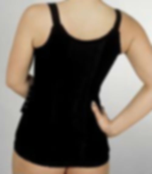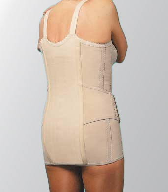 Das Rumpfstützmieder Modell 100 wird unter Einschluß der Büste und der Schulterblätter gearbeitet. Die Stützwirkung wird durch feste Materialien gewährleistet.
